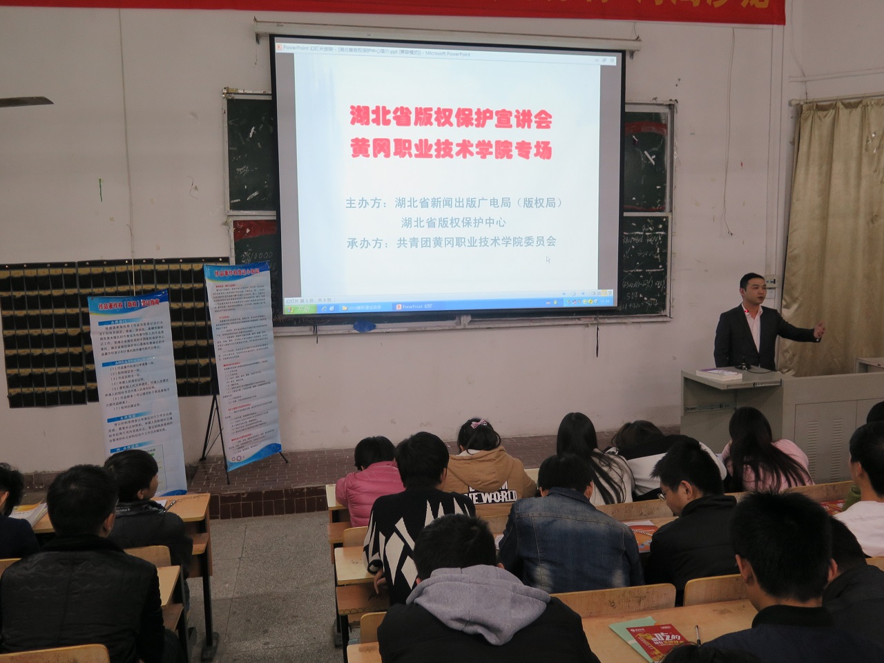 在黃岡市職業(yè)技術(shù)學(xué)院,中心聯(lián)合院團(tuán)委舉行了版權(quán)保護(hù)專題宣講會(huì),學(xué)院各文藝社團(tuán)及院系師生近300人參加。宣講會(huì)針對大學(xué)生群體特點(diǎn),圍繞“弘揚(yáng)憲法精神,推動(dòng)創(chuàng)新、協(xié)調(diào)、綠色、開放、共享發(fā)展”主題,除詳細(xì)講解版權(quán)法律法規(guī)知識外,還著重闡述了版權(quán)保護(hù)對“大眾創(chuàng)業(yè),萬眾創(chuàng)新”的重要促進(jìn)作用,鼓勵(lì)大學(xué)生誠實(shí)創(chuàng)作、勇于創(chuàng)新,加強(qiáng)對知識產(chǎn)權(quán)成果的保護(hù)和運(yùn)用。宣講會(huì)現(xiàn)場,中心工作人員還與廣大學(xué)生進(jìn)行了互動(dòng)交流并為部分師生創(chuàng)作的作品辦理了版權(quán)登記。
