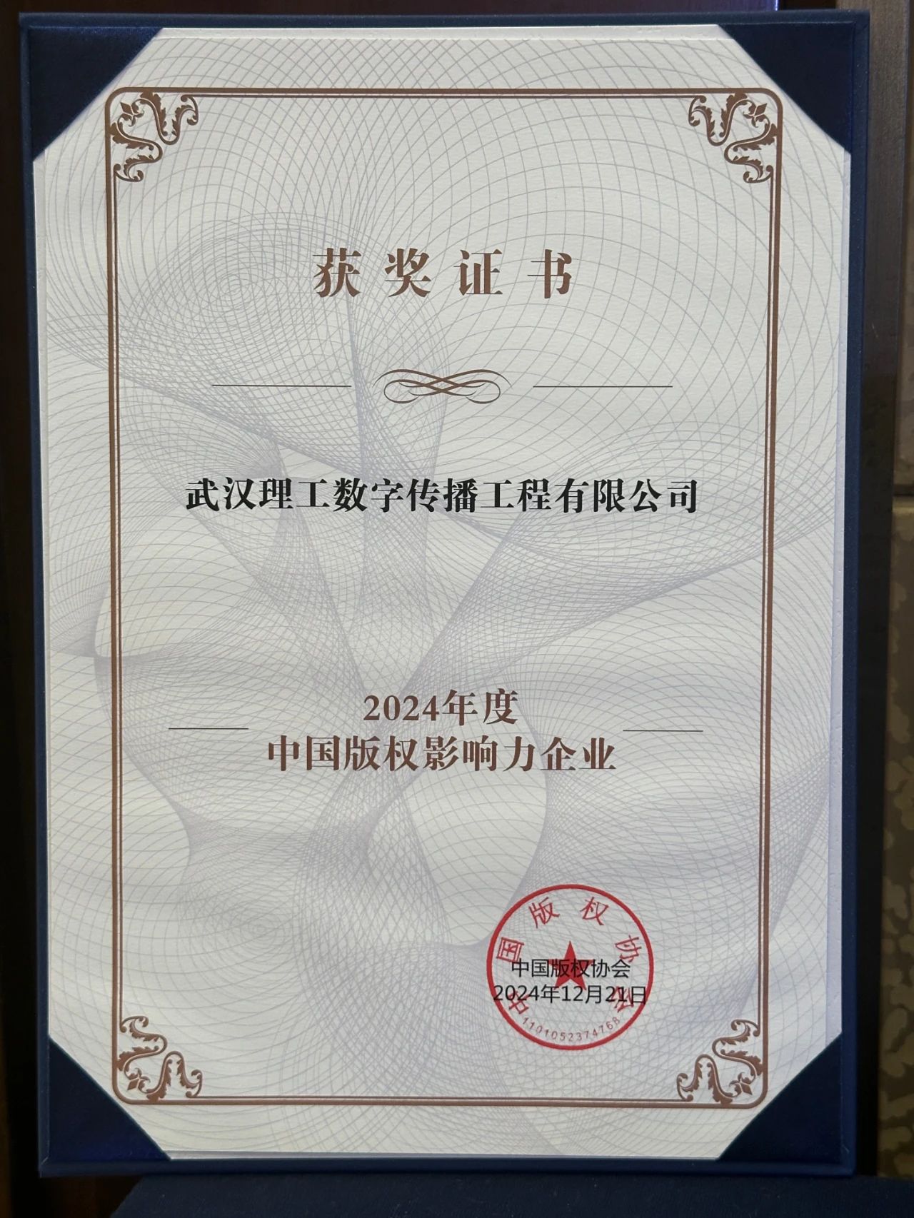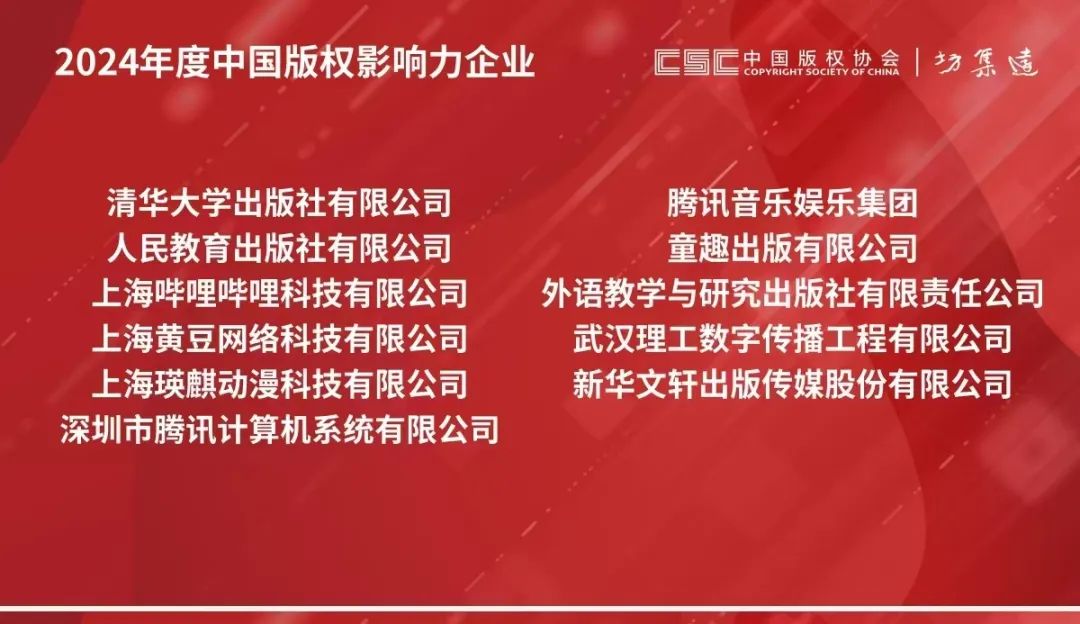 年會公布了2024年度“2024年度中國版權(quán)保護(hù)力企業(yè)”“2024年度中國版權(quán)創(chuàng)新力企業(yè)”“2024年度中國版權(quán)影響力企業(yè)”等名單并授牌。其中,武漢理工數(shù)字傳播工程有限公司分別榮獲“2024年度中國版權(quán)影響力企業(yè)”榮譽(yù)稱號。